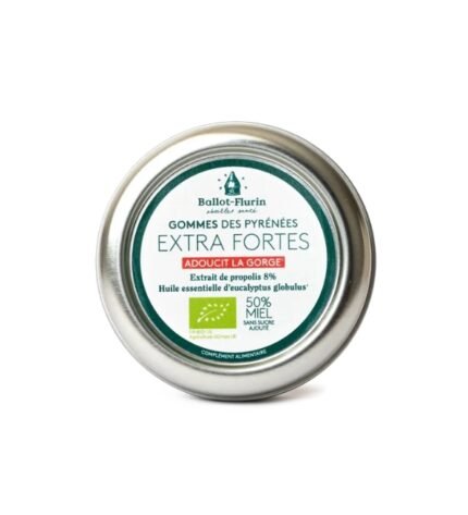 Gommes à base d’huiles essentielles d’eucalyptus globulus*, de propolis noire, de miel et plantes de nos terroirs. *Effet apaisant et