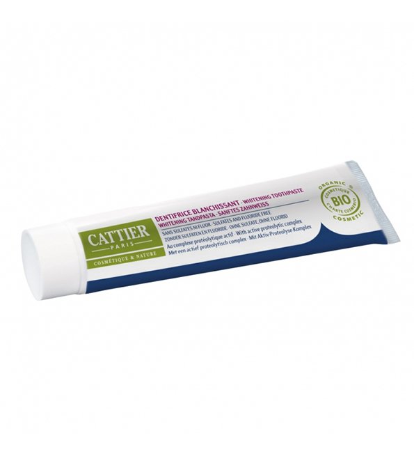 Formulé sans sulfates et sans fluor, ce Dentifrice blanchissant Cattier certifié bio au goût délicat de menthe douce, offre un soin quotidien complet pour des dents blanches et en bonne santé. Des actifs hautement efficaces ont été minutieusement sélectionnés pour blanchir les dents et favoriser l’élimination de la plaque dentaire et du tartre grâce à l’action du complexe protéolytique actif. Polir les dents tout en respectant leur émail grâce à des agents polissants spécifiques.