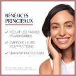 Pour lutter contre les UV nocifs, souvent à l’origine des taches pigmentaires, ce soin doté d’un SPF 30 saura prouver son efficacité en réfléchissant les rayons UVA et UVB. Il permet également d’atténuer les taches brunes et d’avoir un teint plus éclatant et plus uniforme.