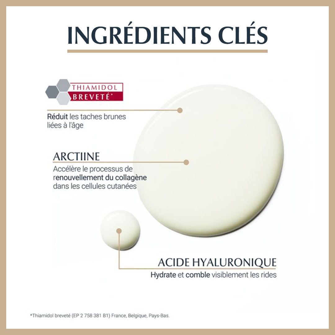 • Les taches liées à l’âge : la formule comprend du Thiamidol*. Breveté par Eucerin, le Thiamidol agit à la source de l’hyperpigmentation. Il est cliniquement prouvé qu’il réduit les taches liées à l’âge et, lorsqu’il est utilisé régulièrement et empêche leur réapparition.