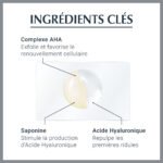 – Une peau lissée et lumineuse : L’émulsion crémeuse contient un complexe AHA (alpha-hydroxy-acide) efficace et de la Glycine Saponine. Les AHA, dont beaucoup sont connus sous le nom d’acides de fruits, exfolient la peau tandis que la Glycine Saponine favorise la production d’Acide Hyaluronique dans les cellules épidermiques où naissent les rides profondes.