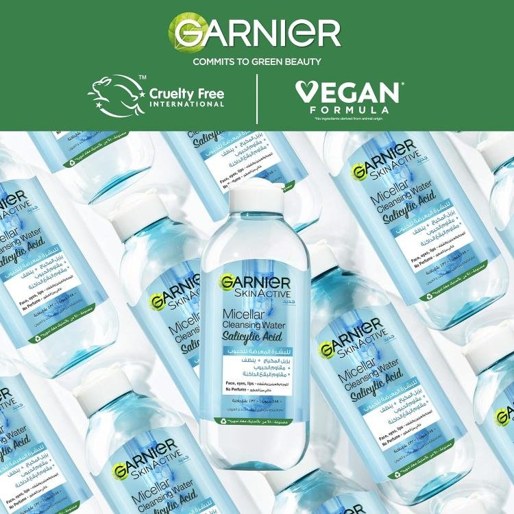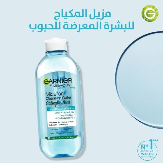 Garnier Skin Active solution eau micellaire à l’acide salicylique. Cette formule a été spécialement développée pour les peaux sujettes à l’acné. Des études cliniques ont prouvé son efficacité pour nettoyer, démaquiller et réduire visiblement les boutons. Infusée d’acide salicylique, cette eau nettoyante est sans parfum et offre une solution pour une peau plus claire et plus fraîche.