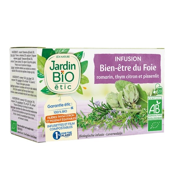 L’infusion Bien-être du foie Jardin BiO est un mélange original et savoureux de plantes complémentaires, comme l’artichaut, le romarin et le pissenlit.