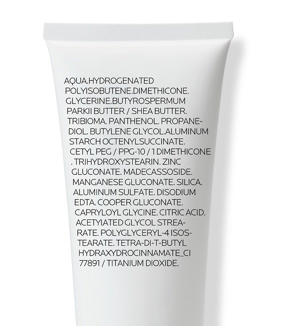 AQUA / WATER, HYDROGENATED POLYISOBUTENE, DIMETHICONE, GLYCERIN, BUTYROSPERMUM PARKII BUTTER / SHEA BUTTER, PANTHENOL, BUTYLENE GLYCOL, ALUMINUM STARCH OCTENYLSUCCINATE, PROPANEDIOL, CETYL PEG/PPG-10/1 DIMETHICONE, TRISTEARIN, ZINC GLUCONATE, MADECASSOSIDE, MANGANESE GLUCONATE, MAGNESIUM SULFATE, DISODIUM EDTA, COPPER GLUCONATE, ACETYLATED GLYCOL STEARATE, POLYGLYCERYL-4 ISOSTEARATE, SODIUM BENZOATE, PHENOXYETHANOL, CHLORHEXIDINE DIGLUCONATE, CI 77891 / TITANIUM DIOXIDE.