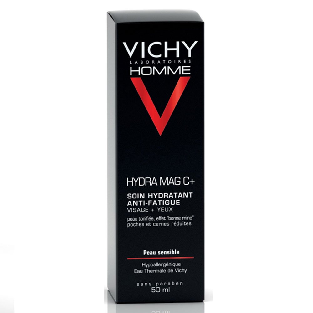VICHY HOMME Hydra Mag C+ Soin Hydratant Anti-Fatigue recharge votre peau en énergie, atténue poches et cernes et aide votre épiderme à lutter contre les agressions.